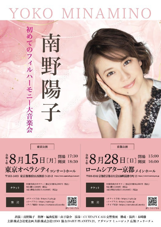 「南野陽子 初めてのフィルハーモニー大音楽会」と題して、南野陽子さんのフルオーケストラコンサートが東京と京都で開催されました。ご来場いただきました皆さま、ありがとうございました。